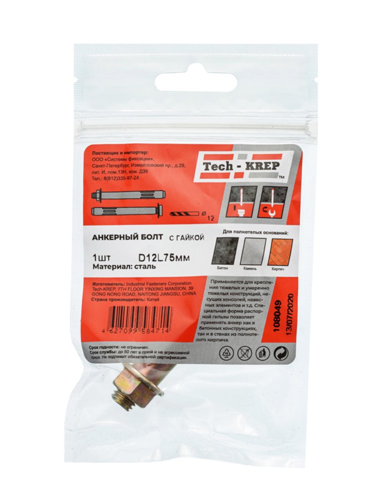 Анкерный болт с гайкой 12х75 (1 шт) - пакет Tech-Krep