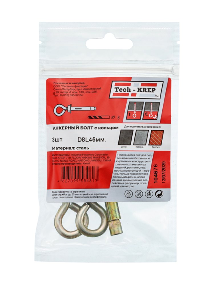 Анкерный болт с кольцом 8х45 мм Tech-Krep, 3 шт. в упаковке. Надежный крепеж для бетона, кирпича, камня. Идеален для подвеса грузов и фиксации тросов.