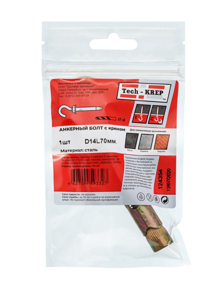 Анкерный болт с крюком 14x70 мм Tech-Krep, 1 шт. в пакете. Из углеродистой стали с цинковым покрытием. Для крепления в бетон, кирпич, камень.