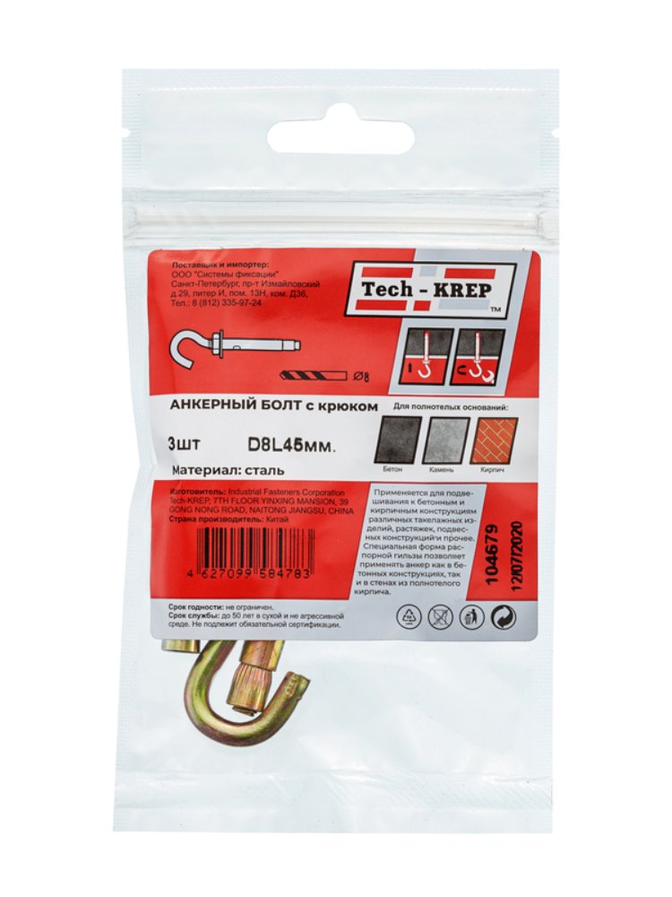Анкерный болт с крюком 8х45 (3 шт) - пакет Tech-Krep в Комсомольск-на-Амуре