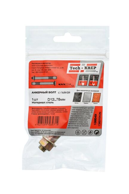 Анкерный болт с гайкой 12х75 (1 шт) - пакет Tech-Krep