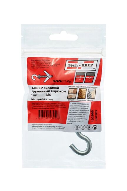 Анкер складной пружинный с крюком М6 (1 шт) - пакет Tech-Krep