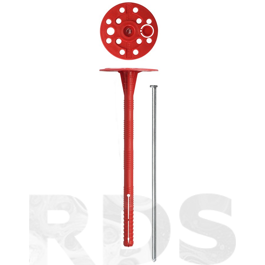 Дюбель крепления теплоизоляции с металлическим гвоздём. Материал - полипропилен Борт – потайной. Дюбель предназначен для крепления тяжелых видов термоизоляционных материалов к бетонному или кирпичному основанию. Шляпка дюбеля способствует надежному удержанию материала теплоизоляции, препятствуя прорыву в месте крепления. Ребра перед распорной зоной препятствуют проваливанию дюбеля в просверленное отверстие. Дюбель для крепления утеплителя к бетону и кирпичу, размер 10×180 мм, комплект 500 шт., прочный пластик, надежная фиксация и быстрый монтаж.