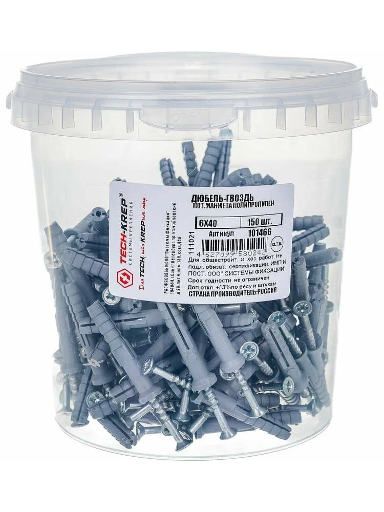 Дюбель-гвоздь 6х40 с потайной манжетой из полипропилена черного цвета от Tech-Krep предназначен для надежного крепления различных конструкций к бетонным, кирпичным и другим твердым основаниям. Диаметр 6 мм и длина 40 мм обеспечивают оптимальную фиксацию. Потайная манжета скрывает крепеж, делая соединение эстетичным, а материал дюбеля устойчив к коррозии и механическим нагрузкам. Комплект поставляется в удобном ведре, содержащем 150 штук, что идеально для крупных строительных и монтажных работ.