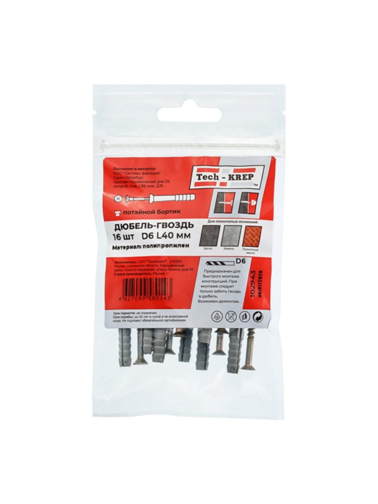 Дюбель-гвоздь 6х40 с потайной манжетой из полипропилена черного цвета от Tech-Krep поставляется в упаковке по 16 штук. Этот крепежный элемент предназначен для надежного монтажа различных конструкций к бетонным, кирпичным или каменным основаниям. Дюбель изготовлен из прочного полипропилена, а гвоздь имеет оцинкованное покрытие, что обеспечивает защиту от коррозии и долговечность крепления. Потайная манжета позволяет скрыть крепеж, обеспечивая эстетичный вид поверхности после установки. Подходит для быстрого и простого монтажа с использованием молотка.