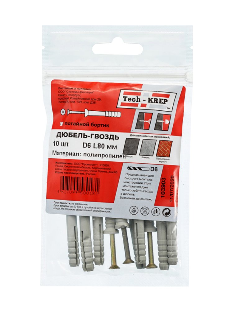 Дюбель-гвоздь 6х80 с потайной манжетой из черного полипропилена от Tech-Krep – это надежный крепежный элемент, предназначенный для монтажа различных конструкций к бетонным, кирпичным и другим твердым основаниям. Комплект из 10 штук поставляется в удобном пакете, что упрощает хранение и транспортировку. Дюбель изготовлен из прочного полипропилена, а гвоздь из оцинкованной стали, что обеспечивает устойчивость к коррозии и долговечность крепления. Потайная манжета позволяет скрыть крепеж, делая монтаж аккуратным и эстетичным. Диаметр 6 мм и длина 80 мм подходят для большинства стандартных задач в строительстве и ремонте.
