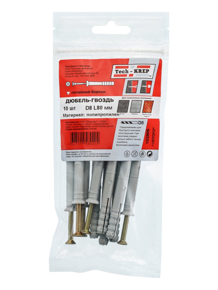 Дюбель-гвоздь 8х80 с потайной манжетой из полипропилена черного цвета от Tech-Krep поставляется в упаковке по 10 штук. Этот крепежный элемент предназначен для надежного монтажа различных конструкций к бетонным, кирпичным или каменным основаниям. Потайная манжета обеспечивает аккуратный внешний вид соединения, скрывая крепеж в поверхности материала. Изготовлен из прочного полипропилена, устойчивого к коррозии и механическим нагрузкам, что гарантирует долговечность крепления.