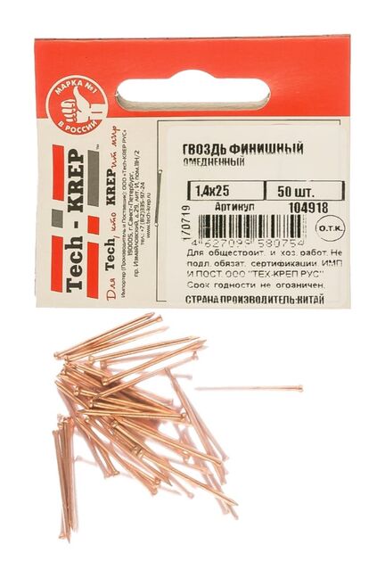 Финишный бронзовый гвоздь 1,4х25 мм Tech-Krep, 50 шт. в упаковке. Стальной, с бронзовым покрытием, для отделочных работ. Надежный и незаметный крепеж.