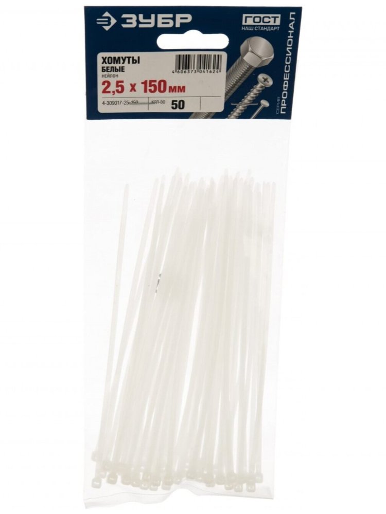 Хомут ЗУБР нейлоновый, в полиэтиленовом пакете, тип 7, белые, 2,5мм 150мм, 50шт