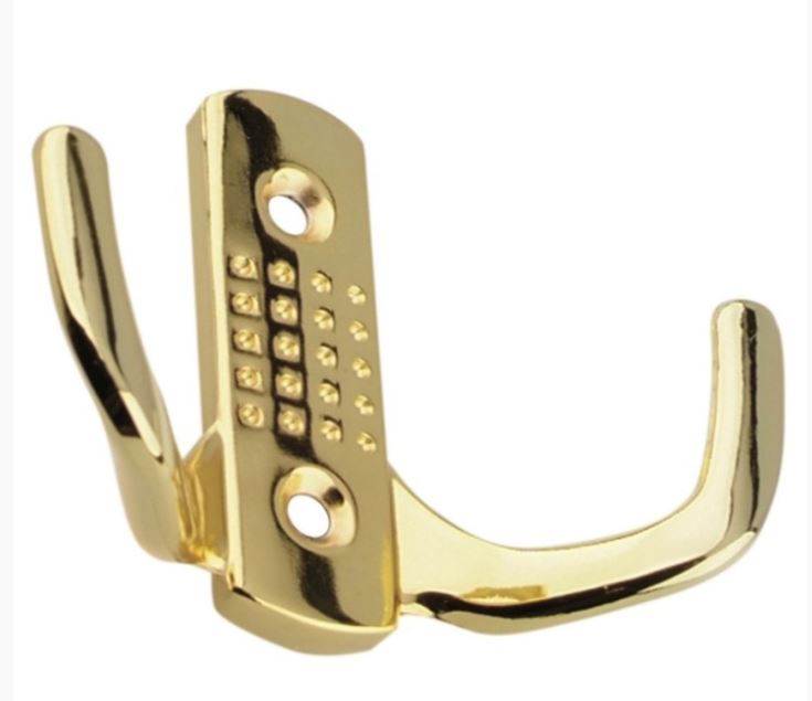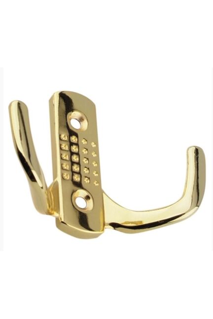 Металлический крючок с двумя рожками для одежды и аксессуаров, покрытие золото, выдерживает умеренную нагрузку, подходит для дома и офиса.