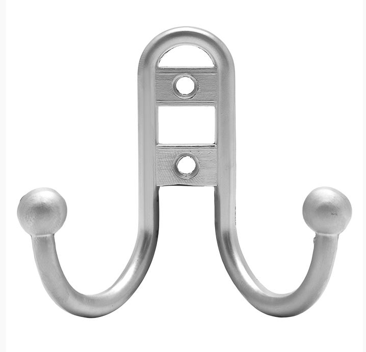 Двухрожковый крючок из металла с покрытием под серебро, компактен, легко крепится, подходит для дома, офиса и ванной, выдерживает высокую нагрузку.