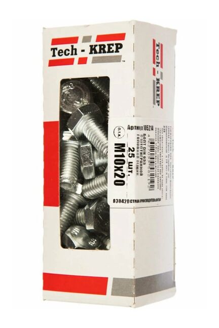 Болт DIN933 с шестигранной головкой оцинк. М10х20 (25 шт) - коробка с ок. Tech-Krep
