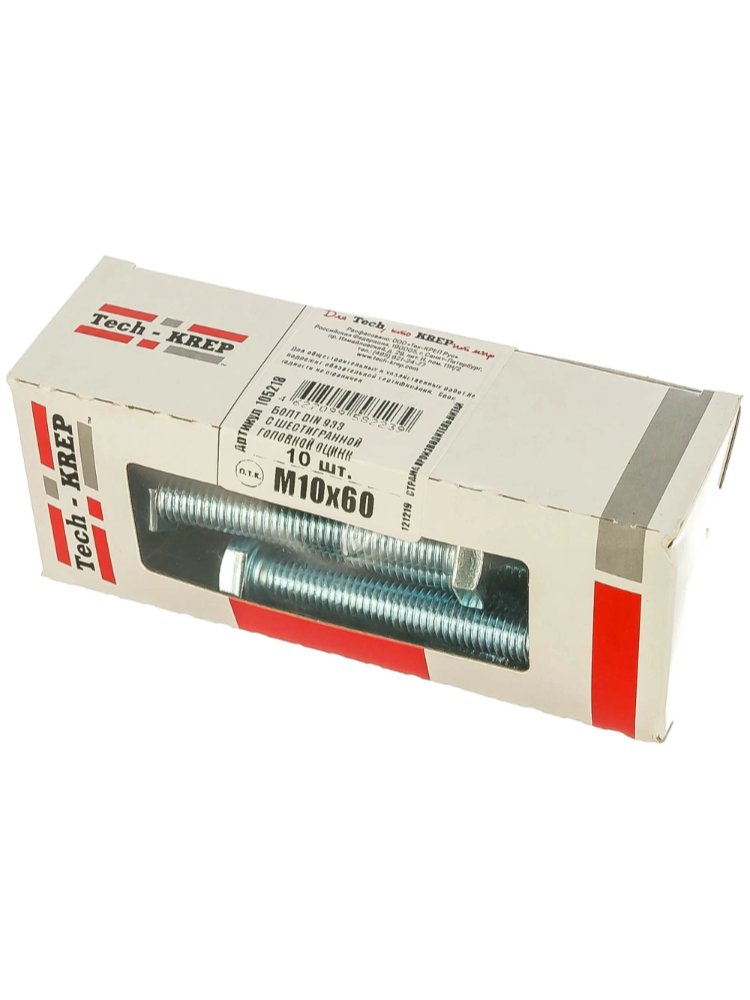 Болт DIN 933 М10х60 с шестигранной головкой, оцинкованный, 10 шт. в коробке с окном Tech-Krep. Надежный крепеж для строительства и ремонта.