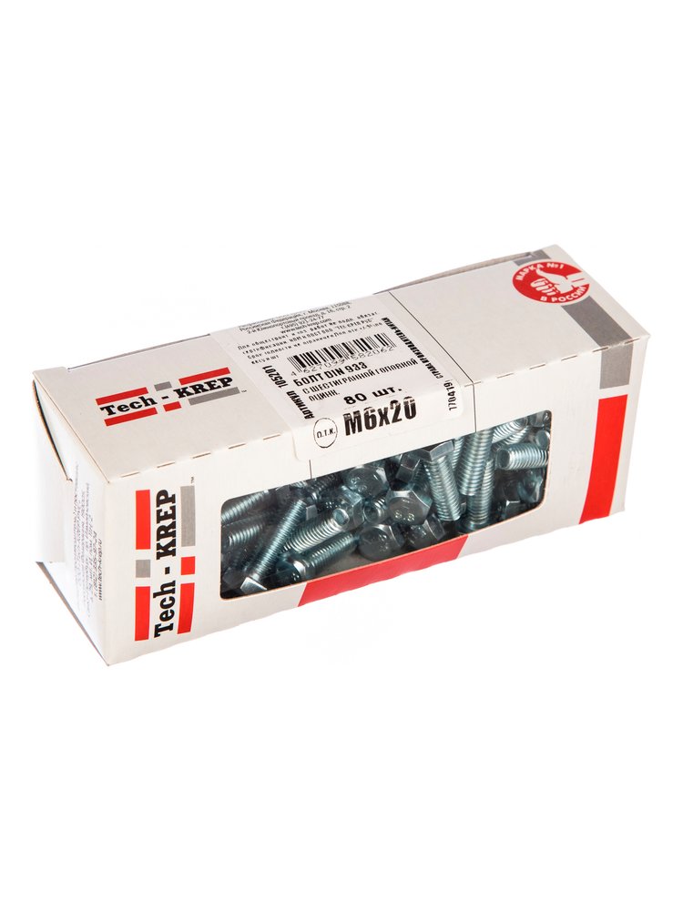 Болт DIN933 с шестигранной головкой оцинк. М6х20 Tech-Krep, 80 шт. в коробке с окном. Надежный крепеж из стали с защитой от коррозии для строительства и ремонта.