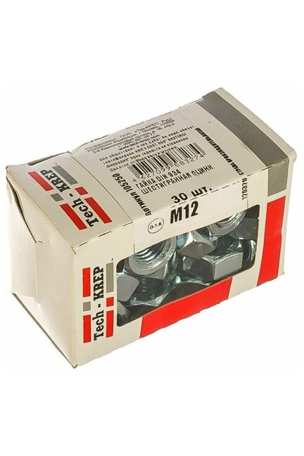 Гайка шестигранная оцинк. М12 DIN 934 Tech-Krep, 30 шт в коробке с окном. Прочный крепеж из стали с защитой от коррозии для надежных соединений.