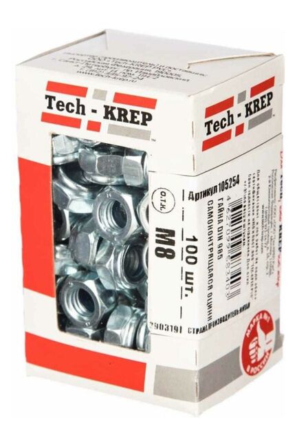 Самоконтрящаяся гайка М8 DIN 985 с цинковым покрытием и нейлоновым кольцом, 14 шт в упаковке Tech-Krep. Надежное крепление, защита от коррозии.
