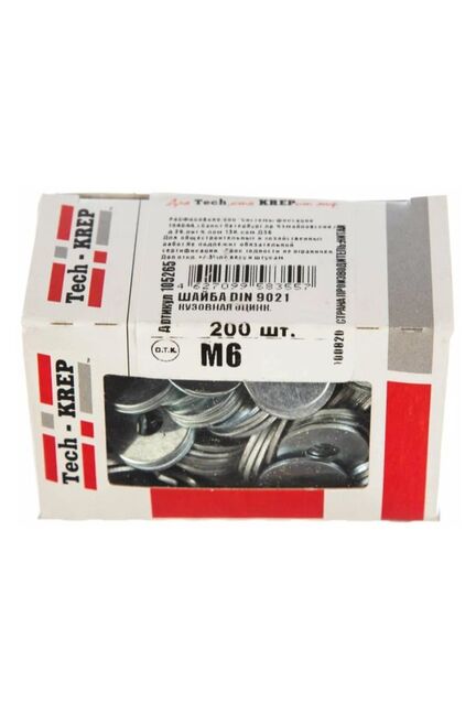 Шайба кузовная оцинкованная М6 DIN 9021 от Tech-Krep, 200 шт. в коробке с окном. Надежное крепление, защита от коррозии, увеличенная площадь опоры.