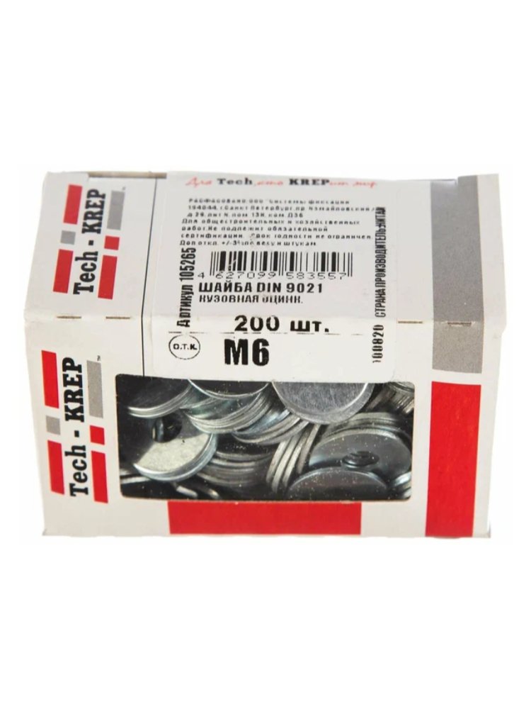 Шайба кузовная оцинкованная М6 DIN 9021 от Tech-Krep, 200 шт. в коробке с окном. Надежное крепление, защита от коррозии, увеличенная площадь опоры.