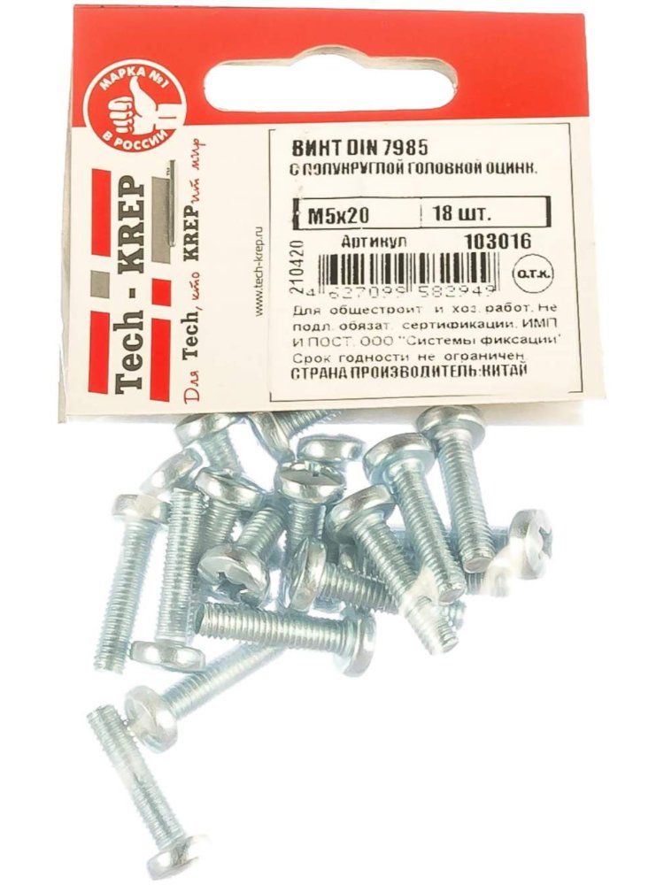 Винт DIN7985 с полукруглой головкой оцинк. М5х20 (18 шт) - пакет Tech-Krep