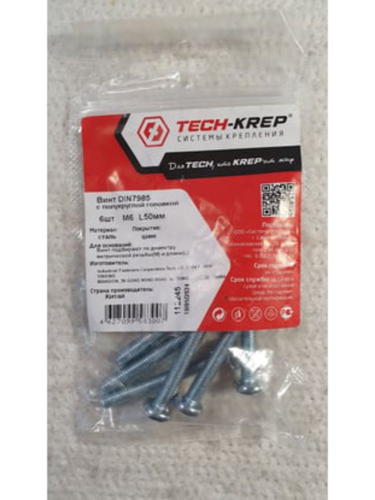 Винт DIN7985 с полукруглой головкой оцинк. M6х50 (6 шт) Tech-Krep – надежный крепеж из стали с защитой от коррозии для строительства и ремонта.