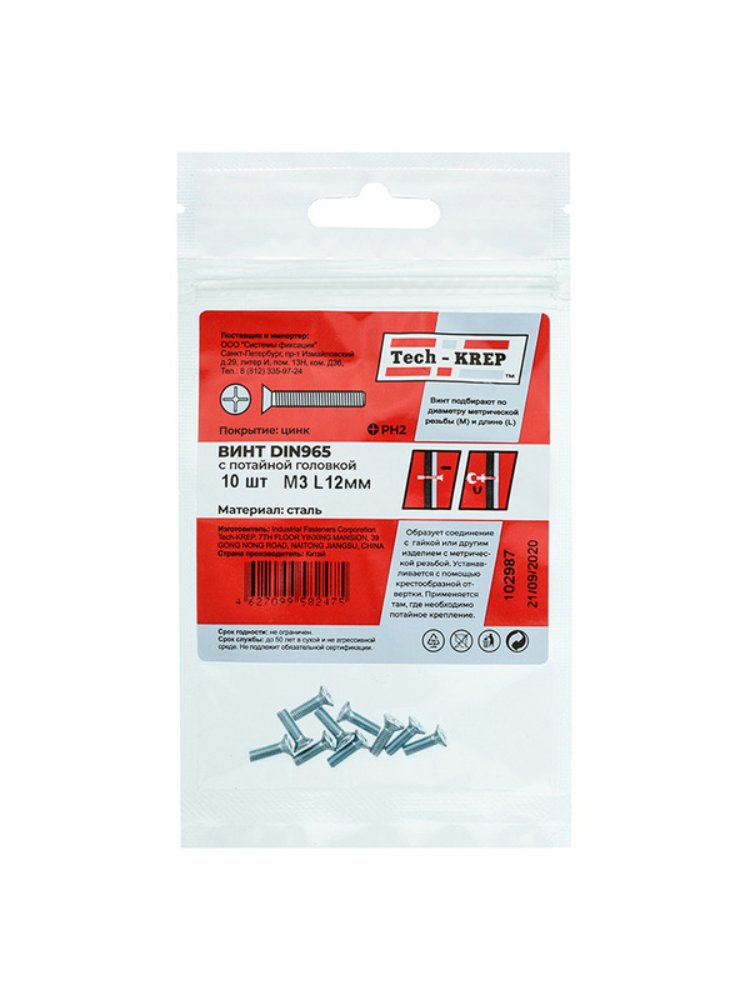 Винт DIN965 с потайной головкой, оцинкованный, М3х12, 10 шт. в упаковке Tech-Krep. Прочный, устойчивый к коррозии крепеж для дерева и металла.