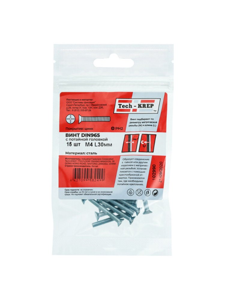 Винт DIN 965 с потайной головкой М4х30, оцинкованный, 15 шт. в упаковке Tech-Krep. Прочный, устойчивый к коррозии, для аккуратного монтажа.