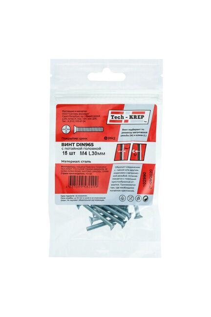 Винт DIN 965 с потайной головкой М4х30, оцинкованный, 15 шт. в упаковке Tech-Krep. Прочный, устойчивый к коррозии, для аккуратного монтажа.