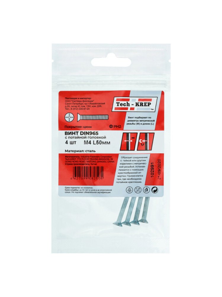 Винт с потайной головкой DIN 965, оцинкованный, размер М4х50, в упаковке 4 штуки от бренда Tech-Krep – надежный крепежный элемент, изготовленный из углеродистой стали с антикоррозионным покрытием. Потайная головка обеспечивает эстетичный вид соединения, так как полностью утапливается в материал. Винт имеет метрическую резьбу, что гарантирует прочное и долговечное крепление. Подходит для работы с различными материалами, включая дерево, металл и пластик, при использовании соответствующих инструментов. Упаковка в виде пакета удобна для хранения и транспортировки.