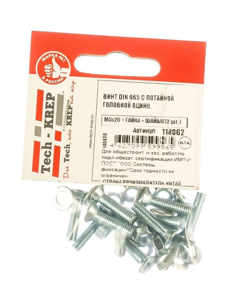 Винт DIN 965 M5х20 с потайной головкой, оцинкованный, в комплекте с гайкой и шайбой (12 шт) от Tech-Krep. Надежный крепеж для строительства и ремонта.