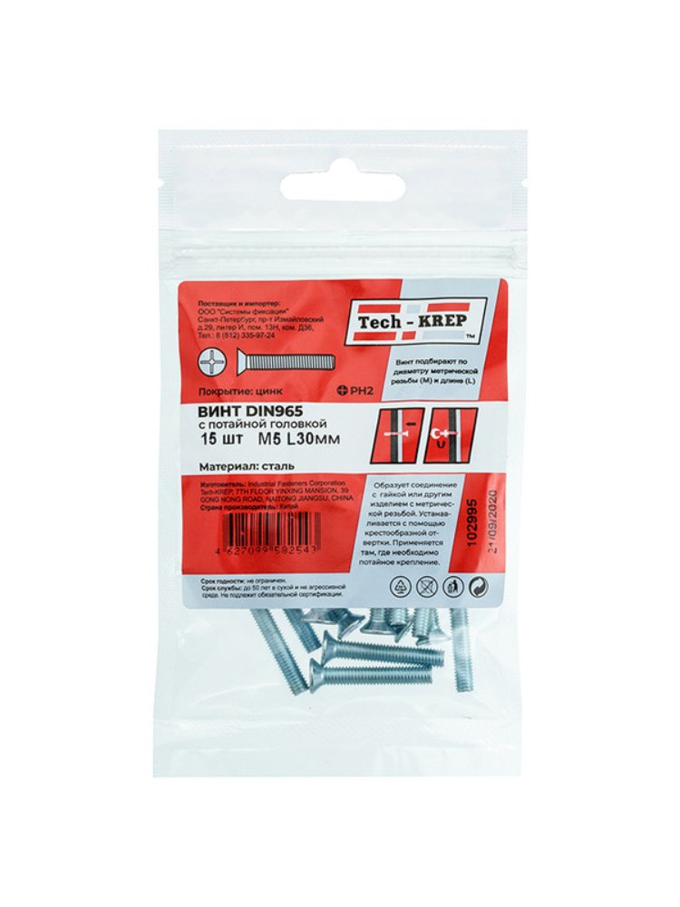 Винт DIN 965 с потайной головкой М5х30, цинковое покрытие, 15 шт. в упаковке Tech-Krep. Надежный крепеж для строительства и ремонта.