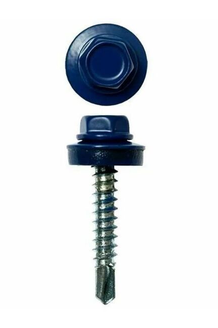 Стальные саморезы с шестигранной со сверловидным наконечником, укомплектованные шайбой с резинкой, для крепления кровельных материалов к деревянной обрещетки. Саморезы 4,8×35 мм, окрашенный ультрамарин, оцинкованные, с шайбой и прокладкой. Идеальные для кровли и фасада. Комплект 3000 шт.