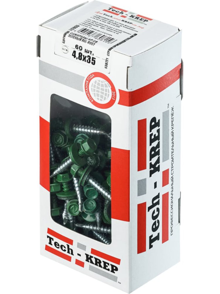 Саморезы КР 4,8х35 мм, зелёные (RAL-6002), 60 шт. в коробке с окном от Tech-Krep. Для кровли и фасадов, антикоррозийное покрытие, прочная сталь.