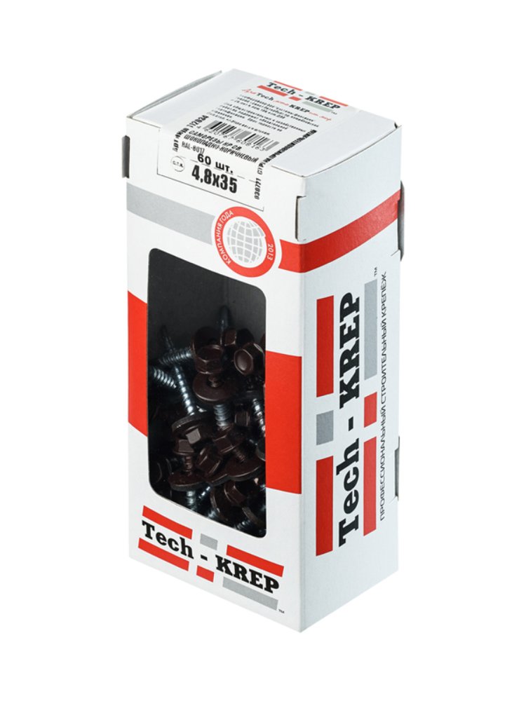 Саморезы кровельные размером 4,8х35 мм в коричневом цвете (RAL-8017) от Tech-Krep предназначены для надежного крепления кровельных материалов к металлическим или деревянным основаниям. Изготовлены из высококачественной углеродистой стали с антикоррозийным покрытием, что обеспечивает долговечность и защиту от ржавчины даже в условиях повышенной влажности. В комплекте 60 штук, упакованных в удобную коробку с окном для визуального контроля количества. Шестигранная головка обеспечивает легкость монтажа с помощью шуруповерта или гайковерта. EPDM-шайба гарантирует герметичность соединения, предотвращая протечки.