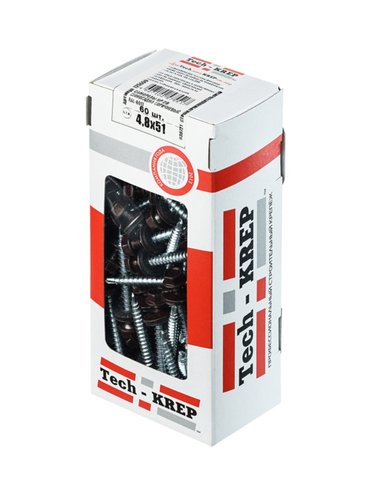 Саморезы КР 4,8х51 мм RAL-8017 (шоколадно-коричневый) Tech-Krep, 60 шт. в коробке с окном. Для кровли и фасадов, сталь с антикоррозионным покрытием.