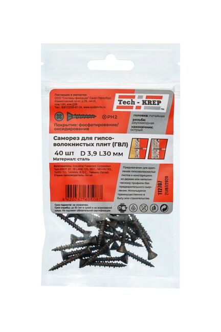 Саморез по ГВЛ 3,9х30 (40 шт) - пакет Tech-Krep