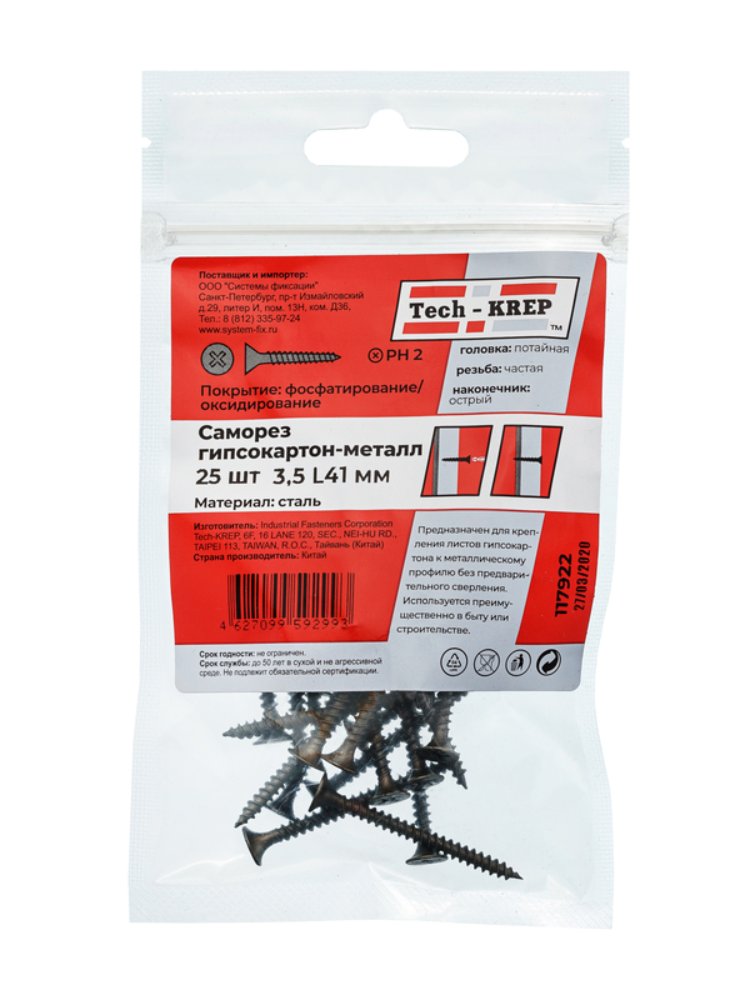Саморез по металлу 3,5х41 (25 шт) - пакет Tech-Krep