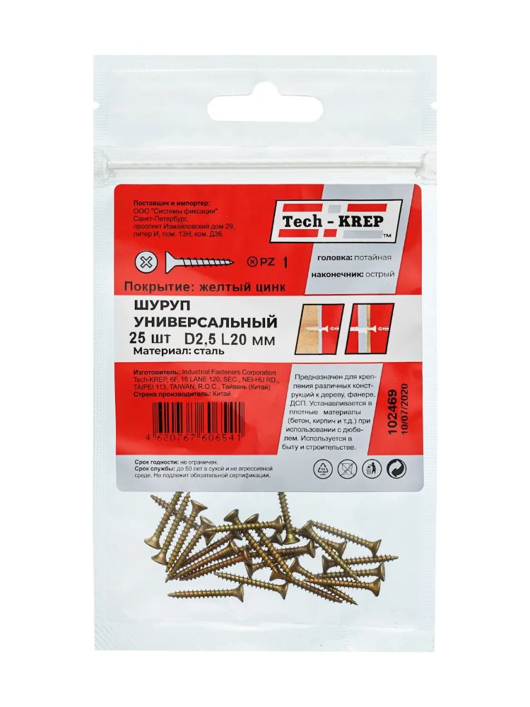 Саморез универс. желтый 2,5х20 пот. гол. (25 шт) - пакет Tech-Krep