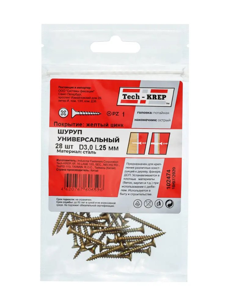 Саморез универс. желтый 3,0х25 пот. гол. (28 шт) - пакет Tech-Krep