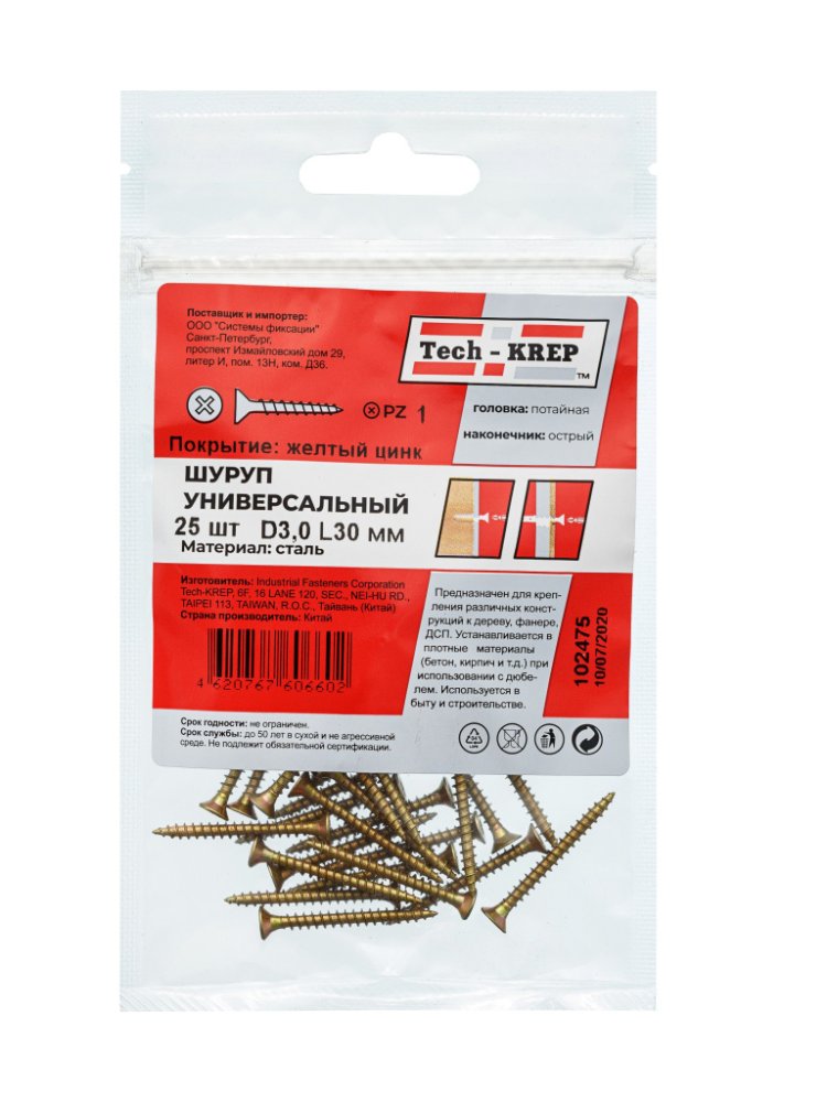 Саморез универс. желтый 3,0х30 пот. гол. (25 шт) - пакет Tech-Krep