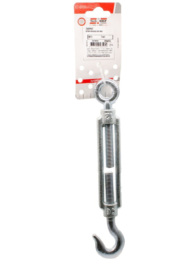 Талреп крюк-кольцо DIN1480 М12 Tech-Krep из оцинкованной стали для натяжения тросов и цепей. Прочный, устойчив к коррозии, прост в установке.