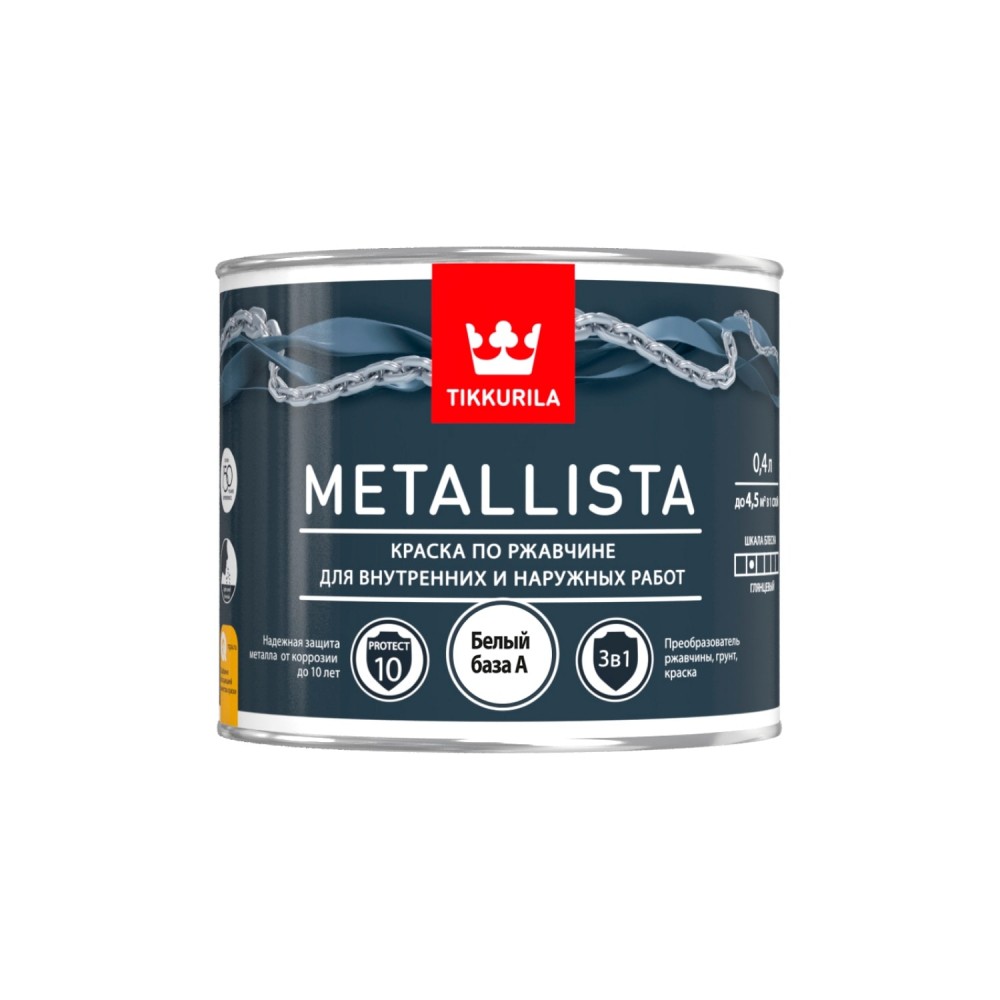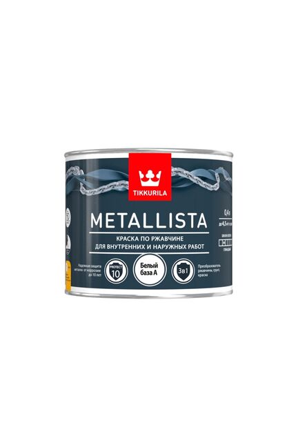 Специальная атмосферостойкая краска по ржавчине для внутренних и наружных работ, сочетает в себе свойства преобразователя ржавчины, антикоррозионной грунтовки и декоративного финишного покрытия. Стальные и чугунные конструкции, садовая мебель, гаражи, ограды, решетки и т.п. Не применяется для полов и ступеней лестниц.Глянцевый. Расход 10–13 м²/л. Время высыхания: 10 часов (базы: А, С / готовые цвета: черный, зеленый, темно-серый, темно-коричневый); 16 часов (готовые цвета: золотистый, серебристый), от пыли - 2 часа.