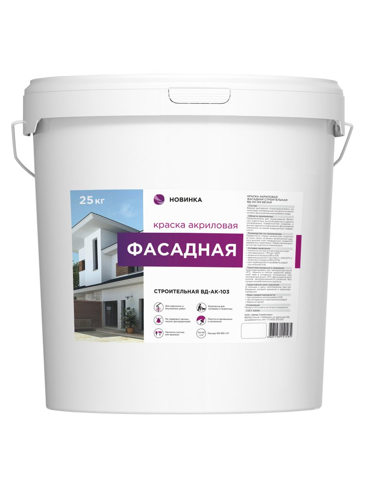 Акриловая фасадная матовая атмосферостойкая краска для окрашивания поверхностей снаружи зданий и сооружений. Подходит для окрашивания поверхностей (стен и потолков) внутри помещений с нормальной и повышенной влажностью. Предназначена для окрашивания поверхностей во всех типах зданий и сооружений, в том числе детских дошкольных, школьных, медицинских учреждений и учреждений пищевой промышленности. Может колероваться машинным способом по любой колеровочной системе. Колеруется только в ненасыщенные (пастельные) тона. Возможна ручная колеровка универсальными пигментыми пастами для красок на водной основе. Белая акриловая фасадная краска для наружных и внутренних работ, устойчивая к погоде, быстро сохнет, легко наносится, 25 кг.