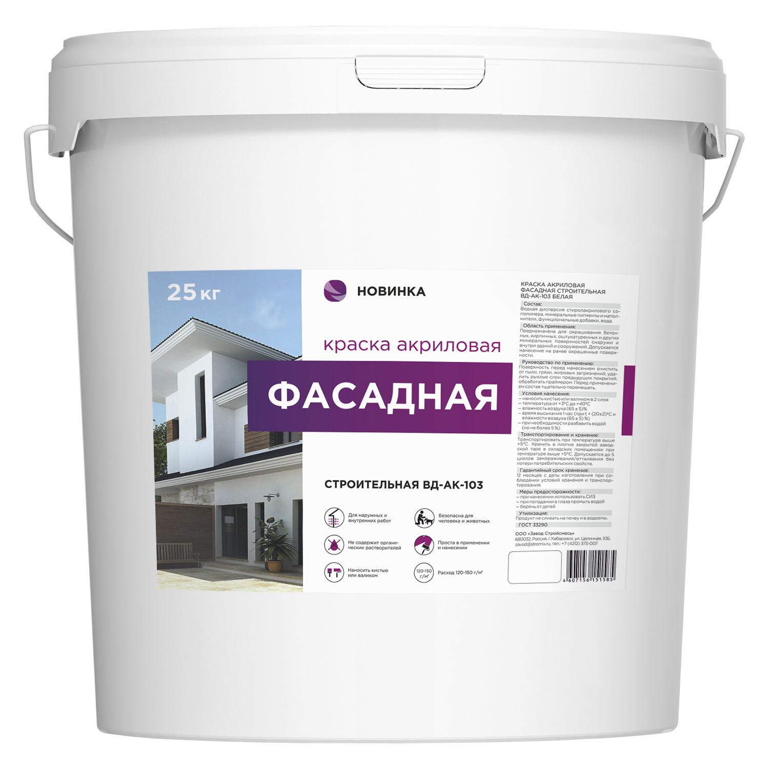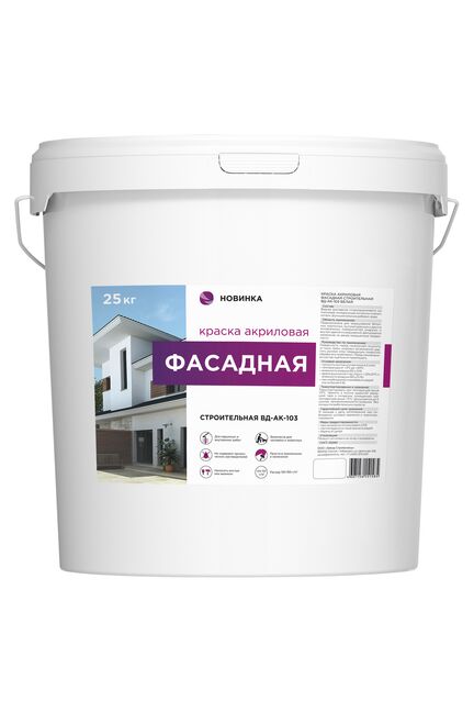 Акриловая фасадная матовая атмосферостойкая краска для окрашивания поверхностей снаружи зданий и сооружений. Подходит для окрашивания поверхностей (стен и потолков) внутри помещений с нормальной и повышенной влажностью. Предназначена для окрашивания поверхностей во всех типах зданий и сооружений, в том числе детских дошкольных, школьных, медицинских учреждений и учреждений пищевой промышленности.