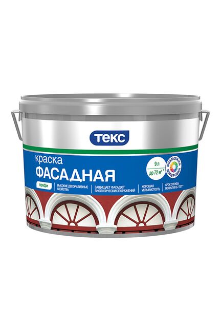 Для окраски фасадов зданий и сооружений по минеральным поверхностям (бетонные основы, цементные штукатурки, не глянцевая строительная керамика), прочно держащимся покрытиям, ранее окрашенным водно-дисперсионными красками, за исключением окрашенных известковыми, силикатными красками и органическими эластичными покрытиями. Краска пригодна для отделочных работ внутри помещения, в том числе с повышенной влажностью. Глубокоматовая. Время высыхания 1 час. Следующий слой наносить через 12 часов. Расход 9-11 м²/л по ровной невпитывающей поверхности; 7-9 м²/л по неровной впитывающей поверхности. Разбавитель - вода. Матовая фасадная краска, устойчива к влаге и выгоранию, легко наносится, подходит для бетона и кирпича, объём 9 л до 90 м².