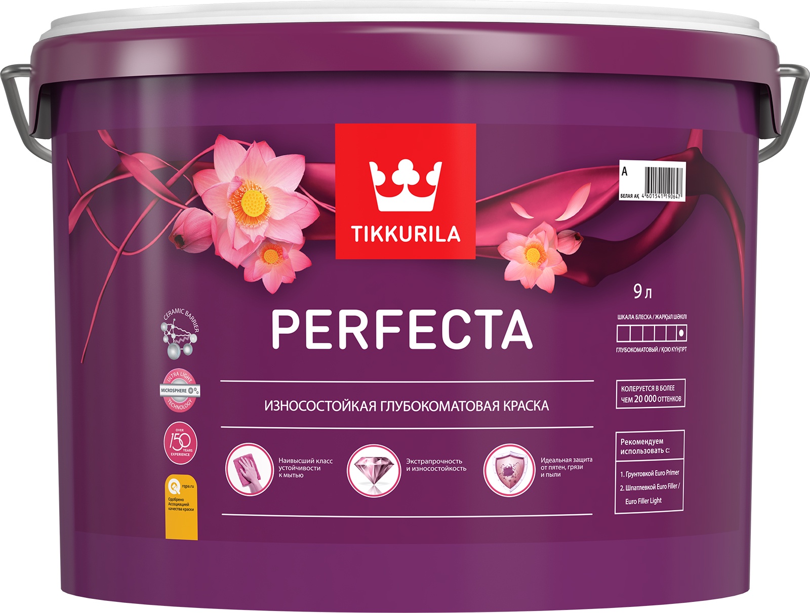 Матовая водно-дисперсионная краска для стен и потолков, быстрая сушка, высокая укрывистость, легко моется и обеспечивает долговечное покрытие.