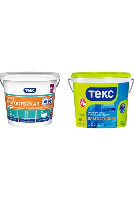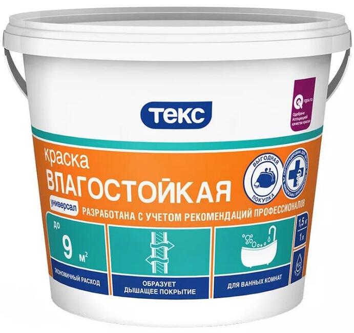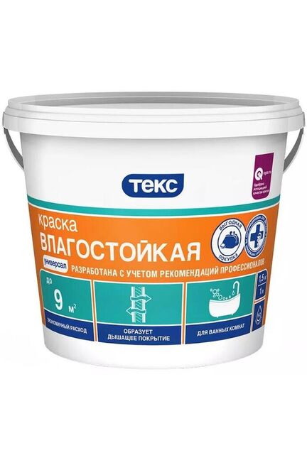 ТЕКС Влагостойкая матовая краска, устойчива к мытью, быстро сохнет, без запаха, для стен и потолков, для влажных помещениях.