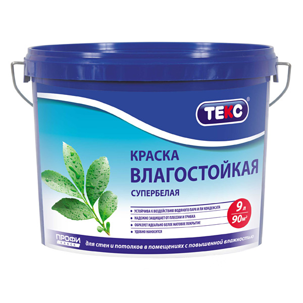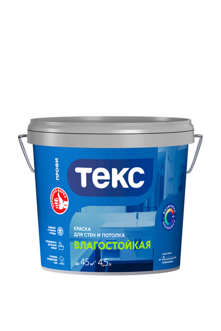 Влагостойкая, белоснежная краска с износостойкой матовой текстурой для стен и потолков в помещениях с повышенной влажностью, объем 4,5 л.