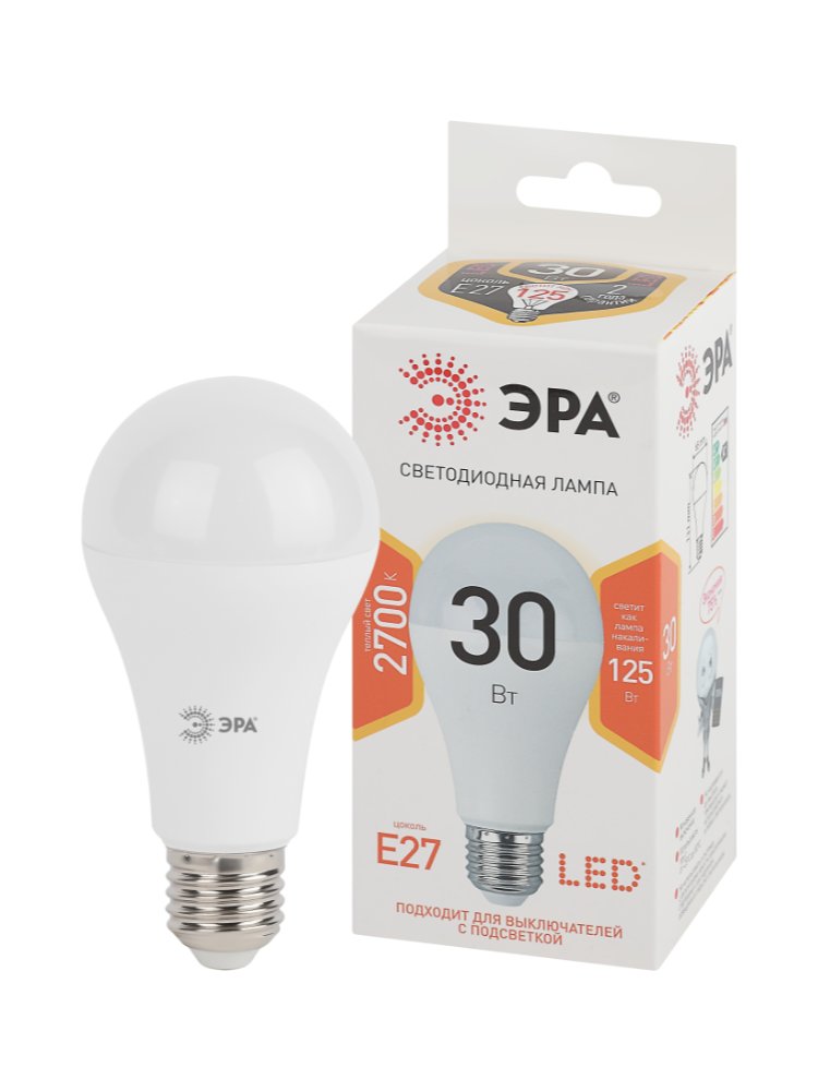 Энергоэффективная LED-лампа 30 Вт с цоколем E27, световой поток 2400 лм, тёплый свет 2700 К, срок службы до 30 000 часов, для дома и офиса.