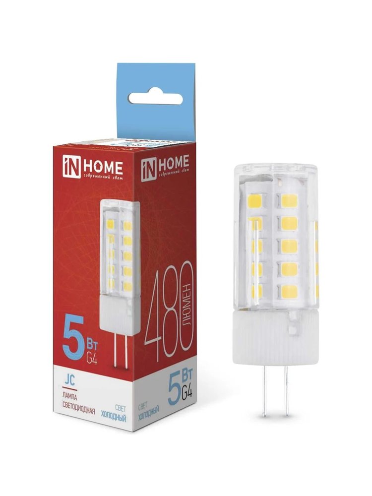 Светодиодная лампа IN HOME LED-JC 5Вт 12В G4 6500К отличное решение для направленного света и акцентной подсветки в жилых и общественных помещениях. Она прекрасно подойдет для декоративно-акцентного освещения в домах, магазинах, гостиницах, ресторанах, музеях и других местах, а также для акцентной подсветки зеркал, мебели, витрин, полок и других предметов интерьера. Лампа LED-JC высокоэффективна, компактна, безопасна, долговечна и способна сократить расходы на электричество до 60% по сравнению с галогенными аналогами. Кроме того, она является экологически чистым источником света. Светодиодная G4 5Вт 12В, 480Лм, холодный белый свет 6500К, энергоэффективная и долговечная лампа для точечных светильников и подсветки.