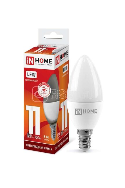 Светодиодная лампа E14, 11Вт, 6500К, 1050лм, экономит электроэнергию, даёт яркий холодный свет и подходит для основного или декоративного освещения.